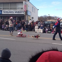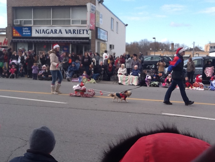 - en-CA Dog pulling a sleigh in the Santa Claus Parade, taken from in front of the Niagara Falls Public Library on Victoria Ave.