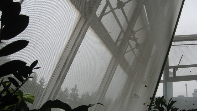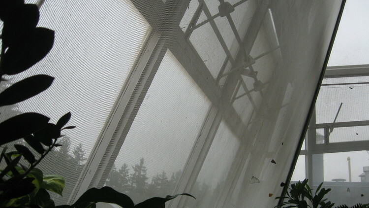 - en-CA Interior view of the Butterfly Conservatory showing butterflies on a window screen.