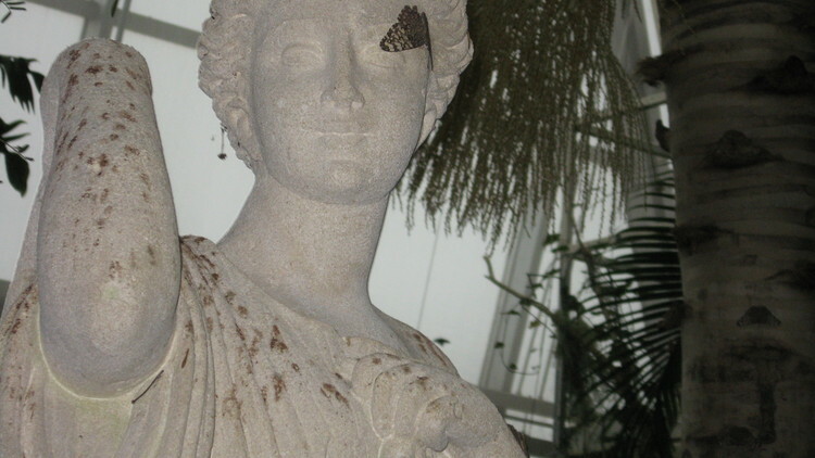 en-CA Interior view of the Butterfly Conservatory showing a butterfly resting on a statue.