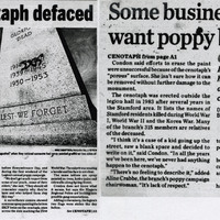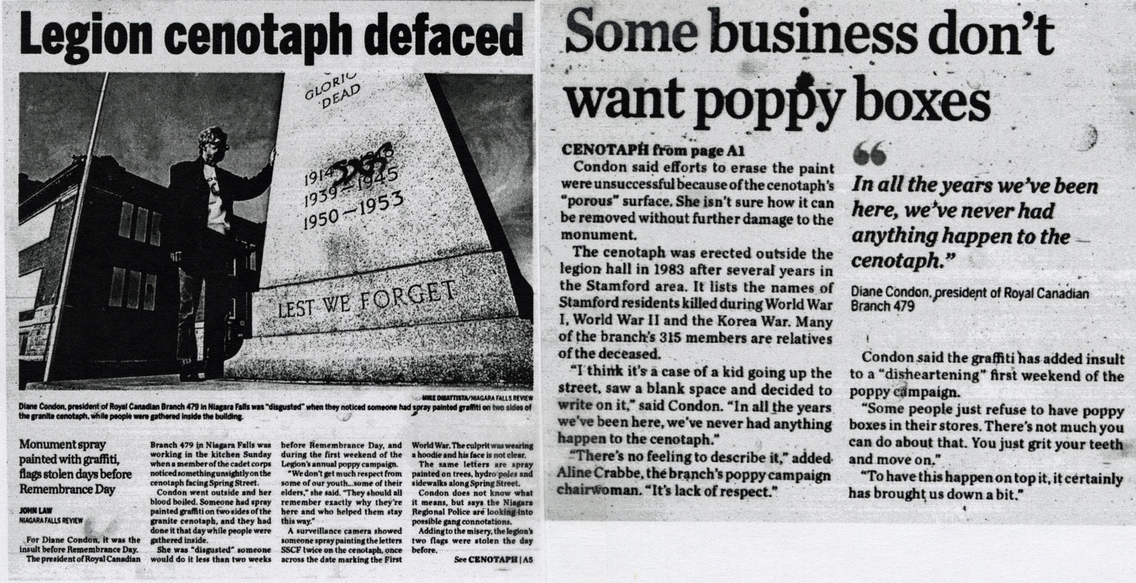 - Legion cenotaph defaced : monument spray painted with graffiti, flags solen days before Remembrance Day
