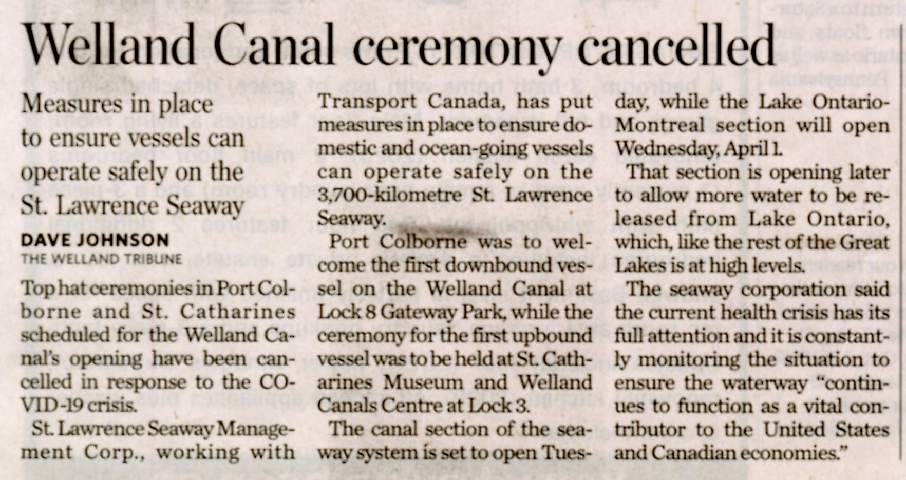 - Welland Canal ceremony cancelled : measures in place to ensure vessels can operate safely on the St. Lawrence Seaway