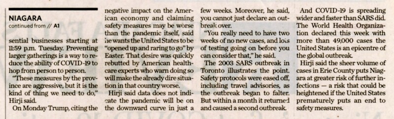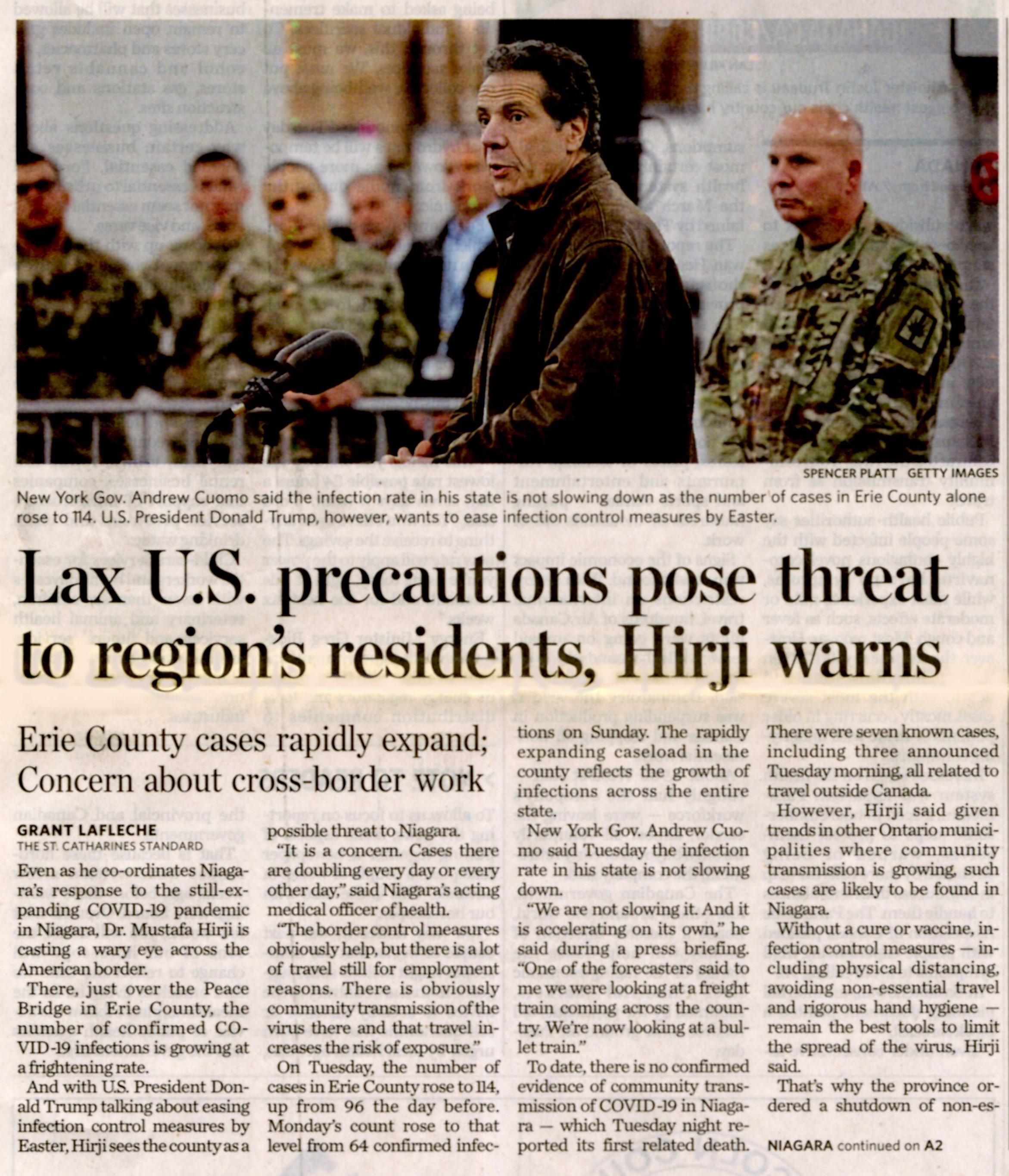 Lax U.S. precautions pose threat to region's residents, Hirji warns : Erie County cases rapidly expand : concern about cross-border work