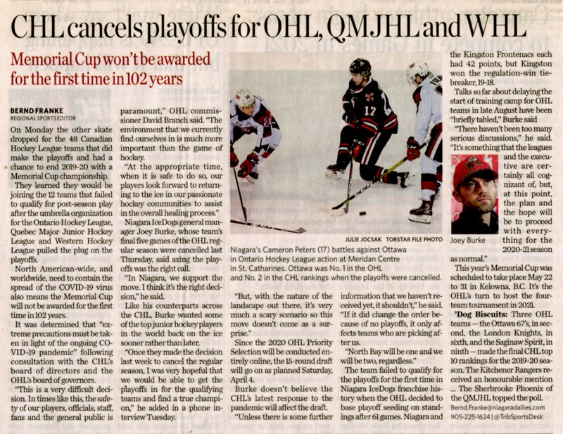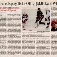 - CHL cancels playoffs for OHL, QMJHL, and WHL : Memorial Cup won't be awarded for the first time in 102 years