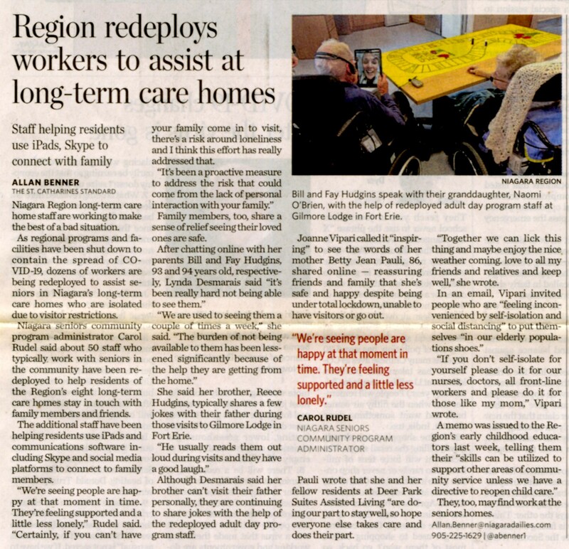- Region redeploys workers to assist at long-term care homes : staff helping residents use iPads, Skype to connect with family