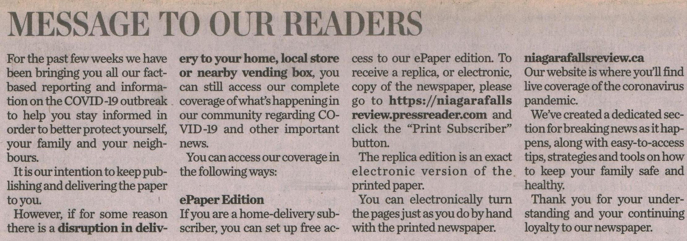 Message to our readers