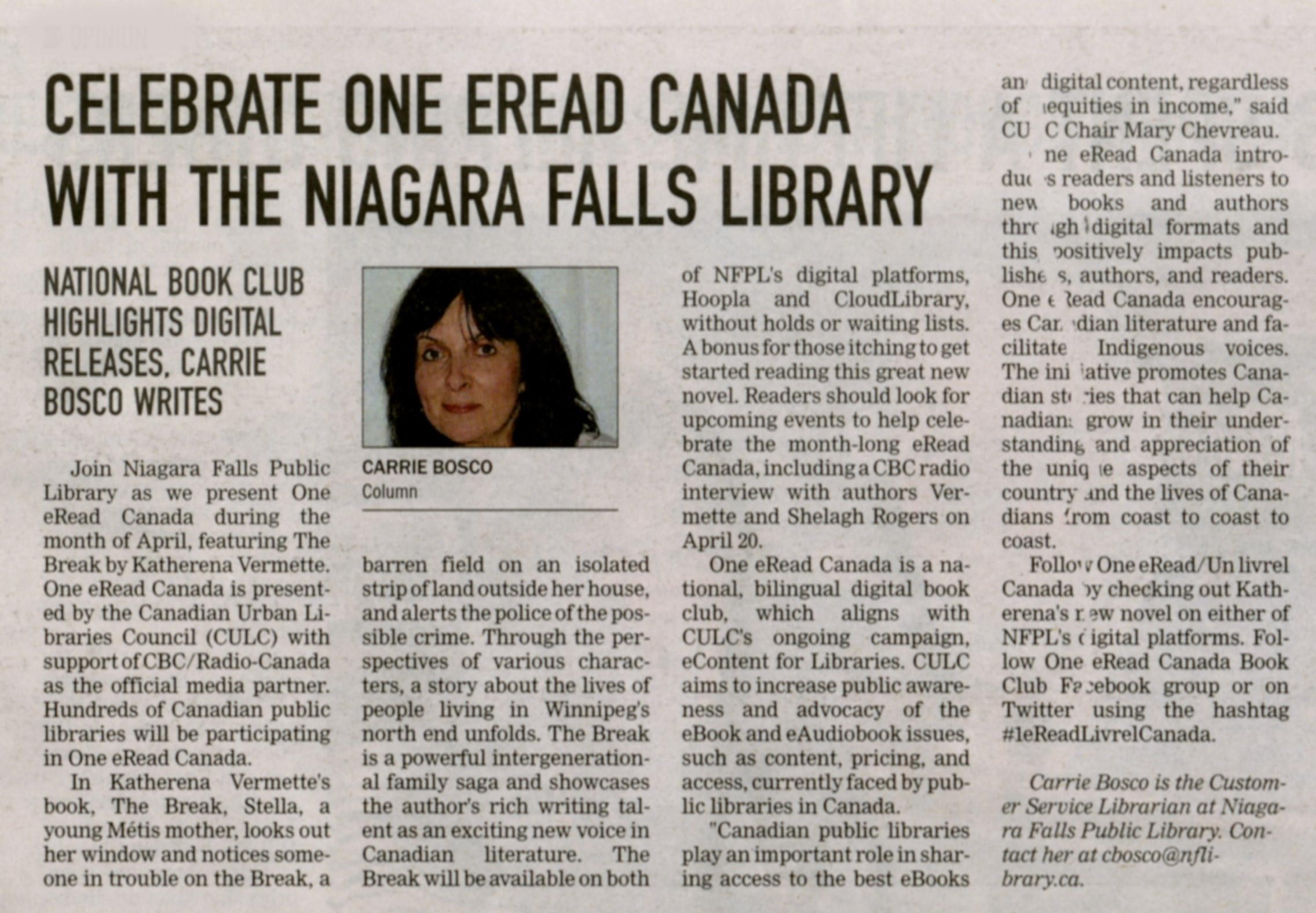- Celebrate One eRead Canada with the Niagara Falls Library : National book club highlights digital releases, Carrie Bosco writes