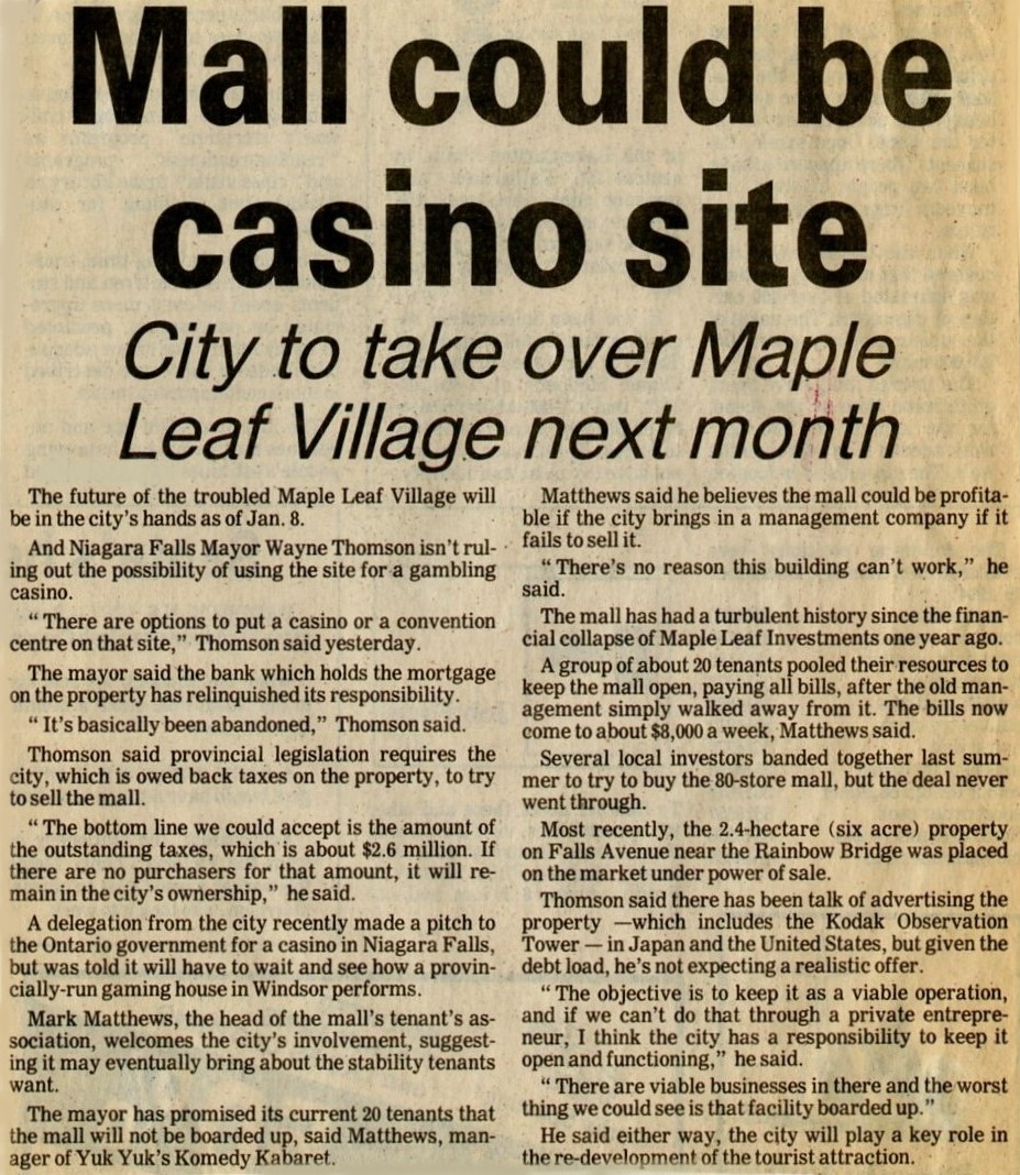 - Mall could be casino site : City to take over Maple Leaf Village next month