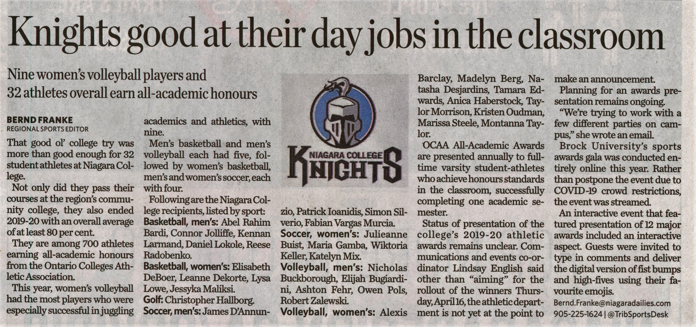 - Knights good at their day jobs in the classroom : Nine women's volleyball players and 32 athletes overall earn all-academic honours