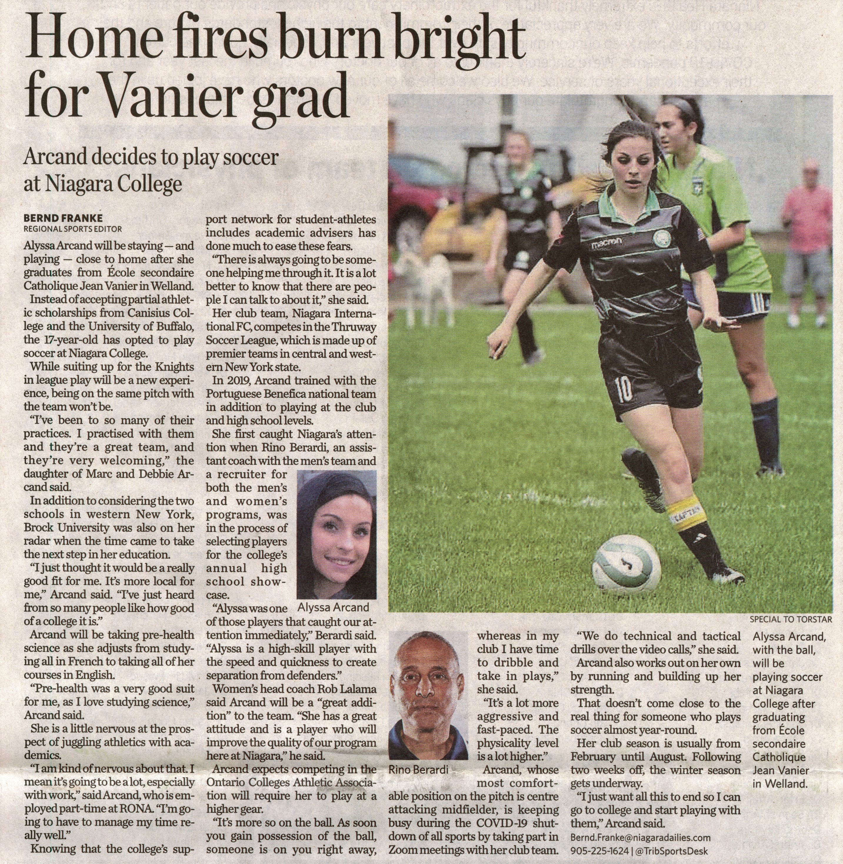- Home fires burn bright for Vanier grad : Arcand decides to play soccer at Niagara College