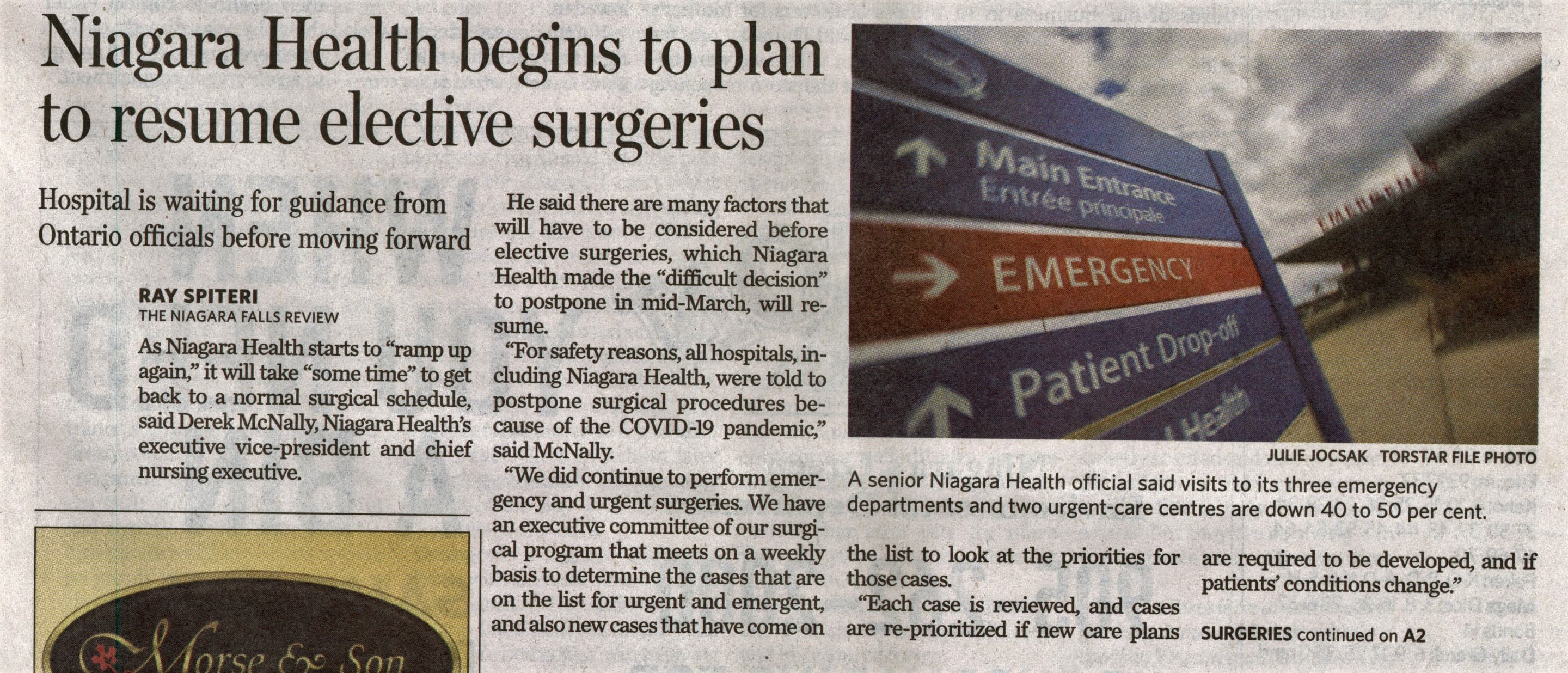 - Niagara Health begins to plan to resume elective surgeries : Hospital is waiting for guidance from Ontario officials before moving forward