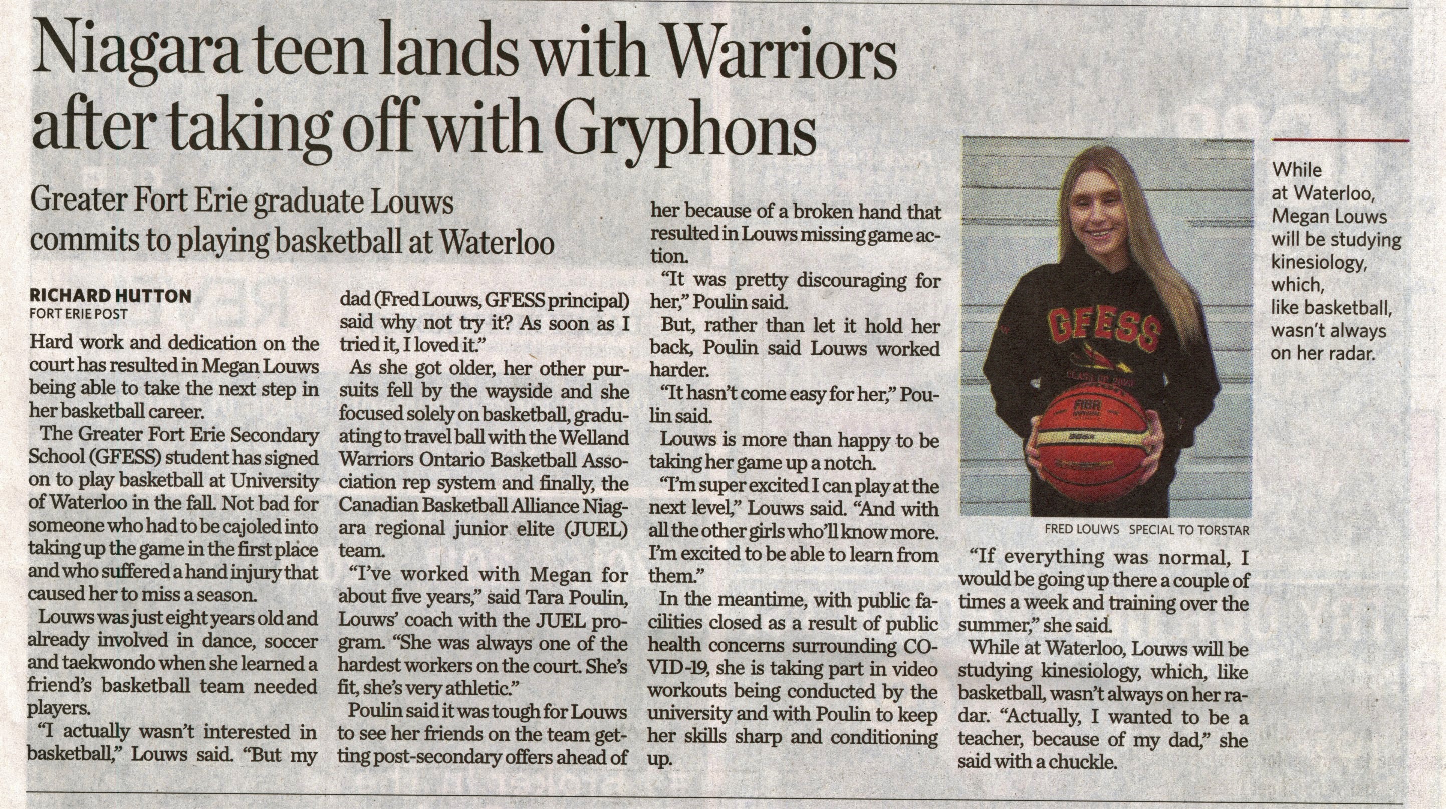 Niagara teen lands with Warriors after taking off with Gryphons : Greater Fort Erie graduate Louws commits to playing basketball at Waterloo