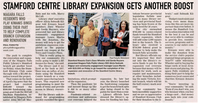 Stamford Centre Library expansion gets another boost : Niagara Falls residents who play Kiwanis bingo doing their part to help complete branch expansion and renovation