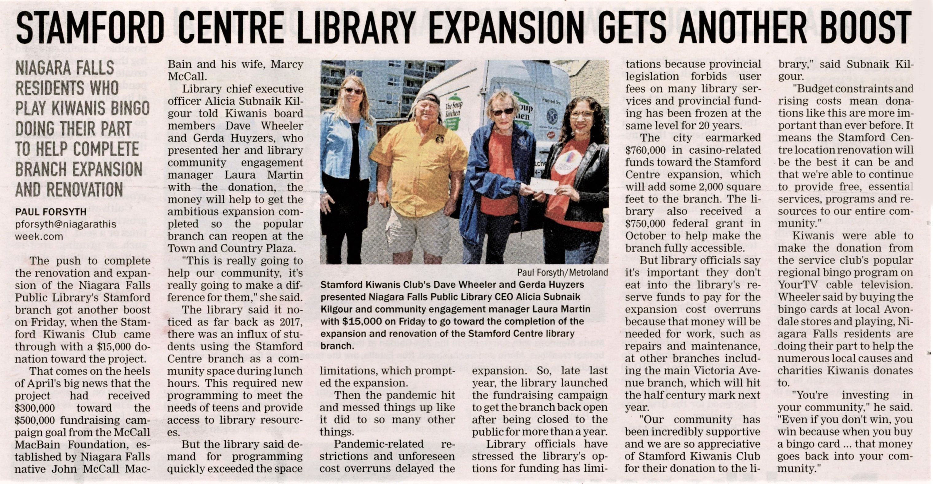 - Stamford Centre Library expansion gets another boost : Niagara Falls residents who play Kiwanis bingo doing their part to help complete branch expansion and renovation