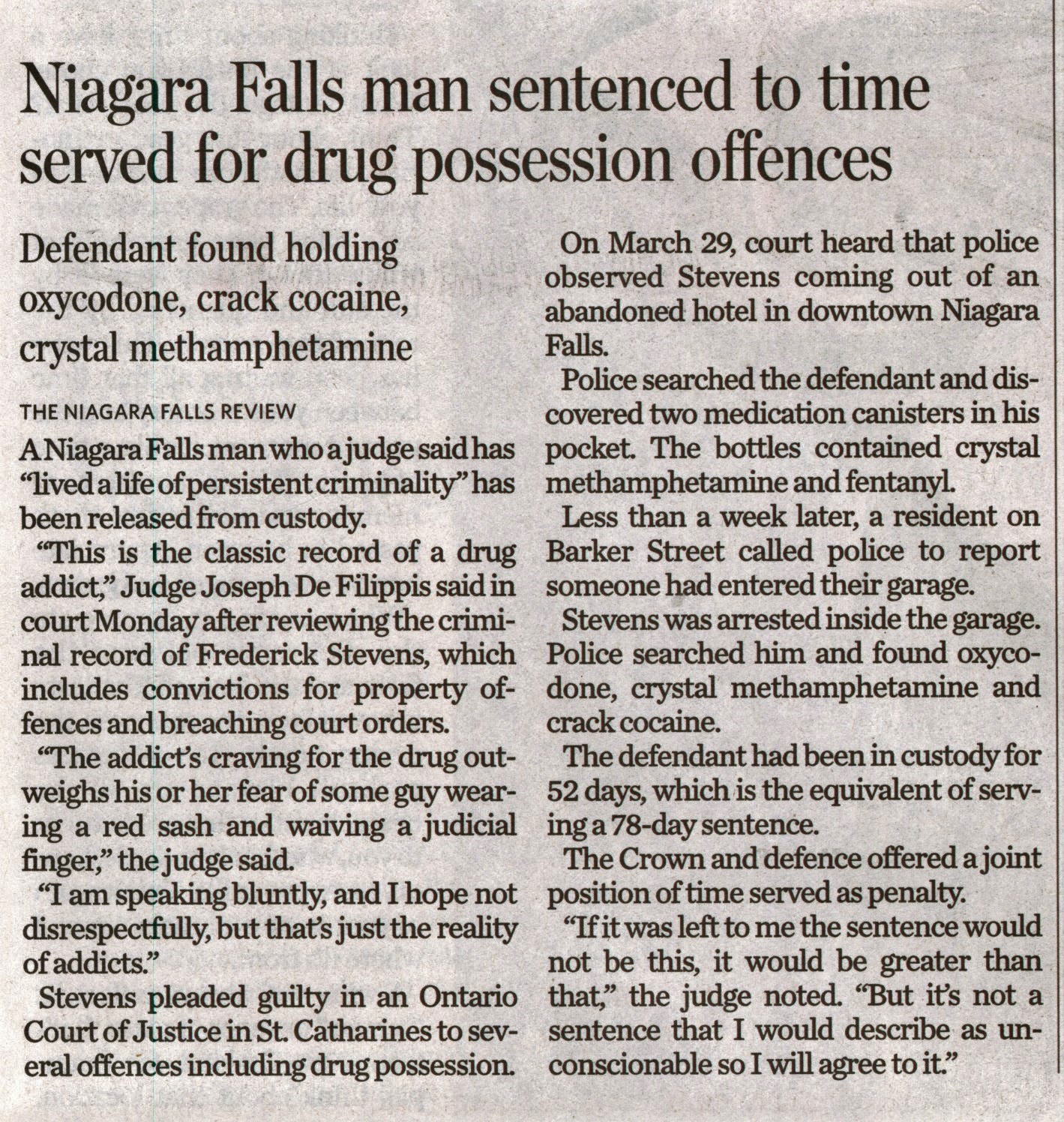 - Niagara Falls man sentenced to time served for drug possession offences : Defendant found holding ocycodone, crack cocaine, crystal methamphetamine