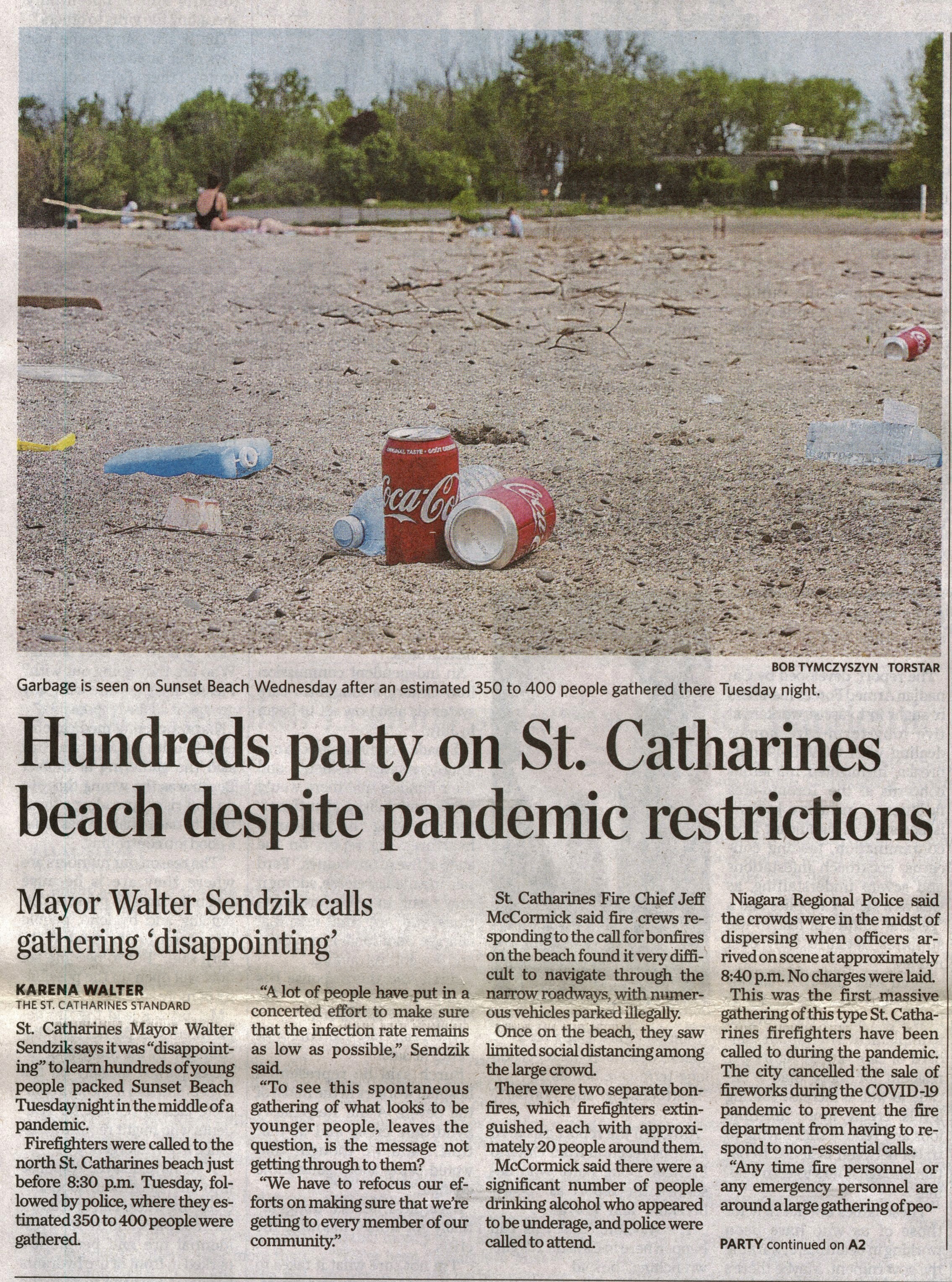 - Hundreds party on St. Catharines beach despite pandemic restrictions : Mayor Walter Sendzik calls gathering 'disappointing'