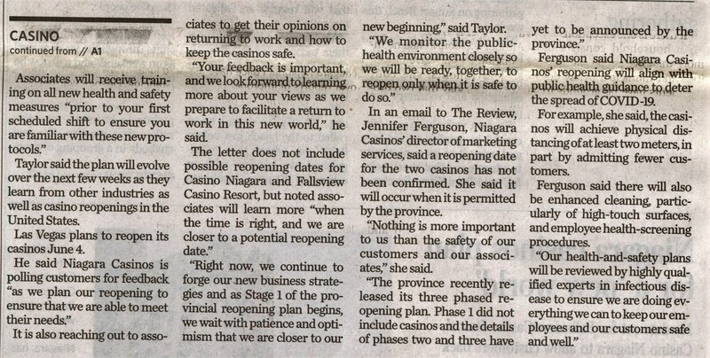 - Niagara casinos plan for a 'new world : No date set for Fallsview Casino Resort to allow customers back once safety measures are properly in place