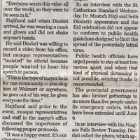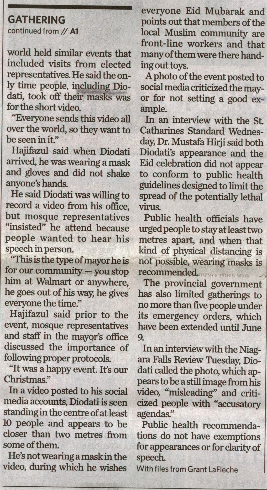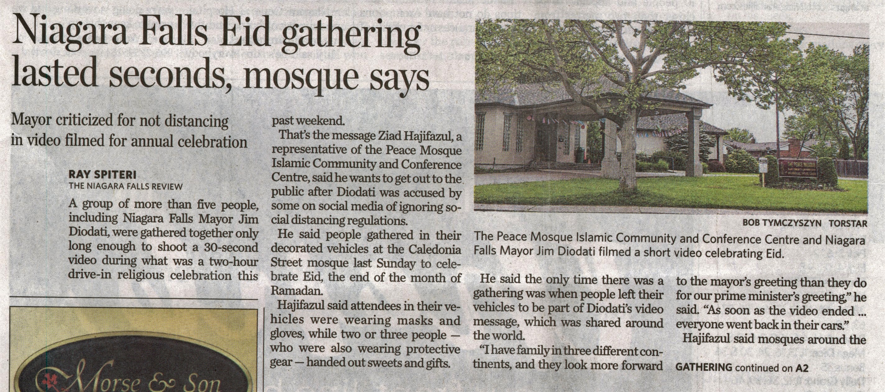 - Niagara Falls Eid gathering lasted seconds, mosque says : Mayor criticized for not distancing in video filmed for annual celebration