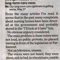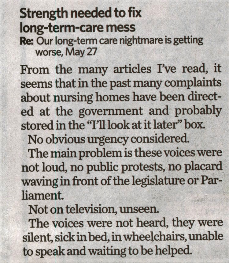 - Strength needed to fix long-term-care mess Re: Our long-term care nightmare is getting worse, May 27