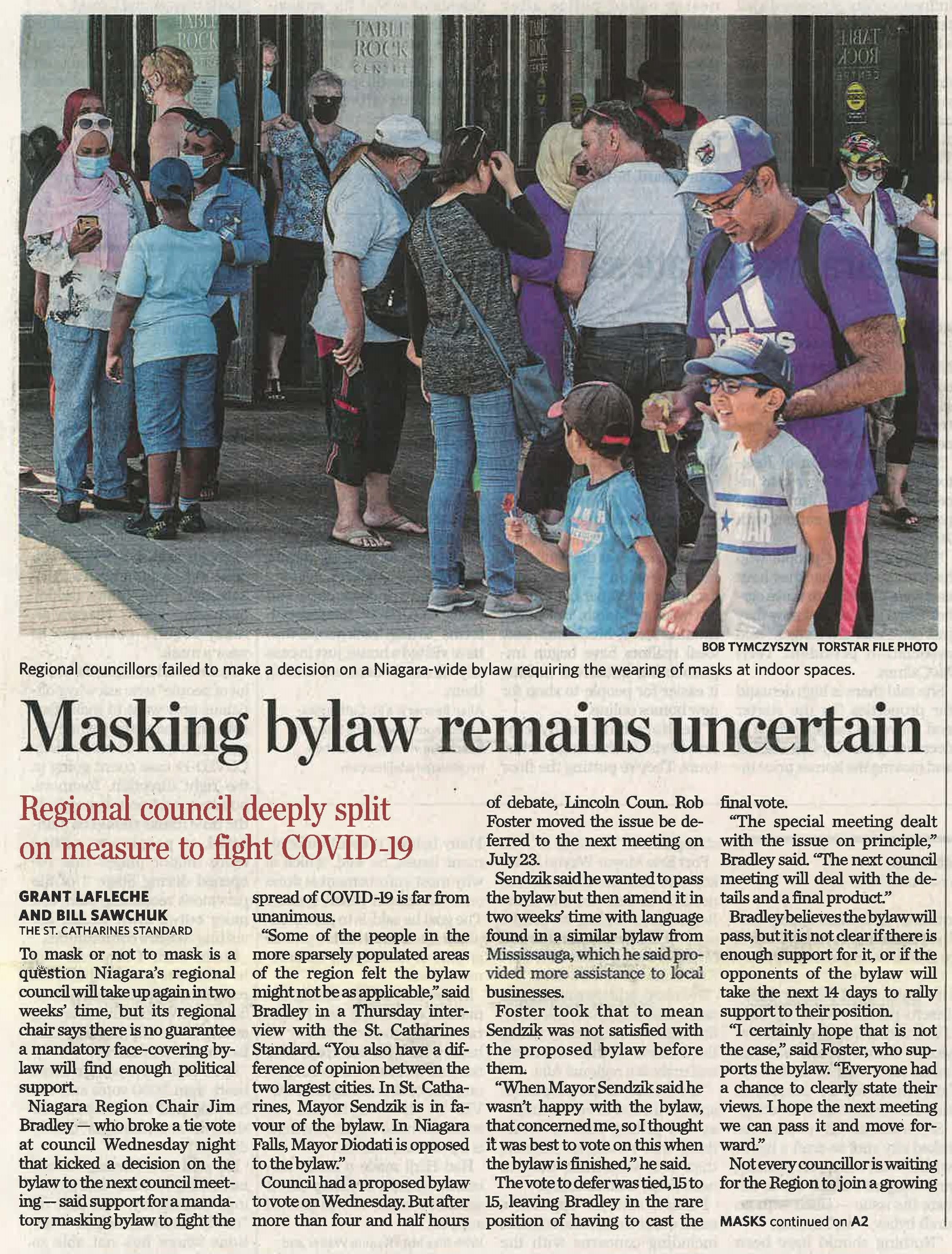 - Masking bylaw remains uncertain : regional council deeply split on measure to fight COVID-19