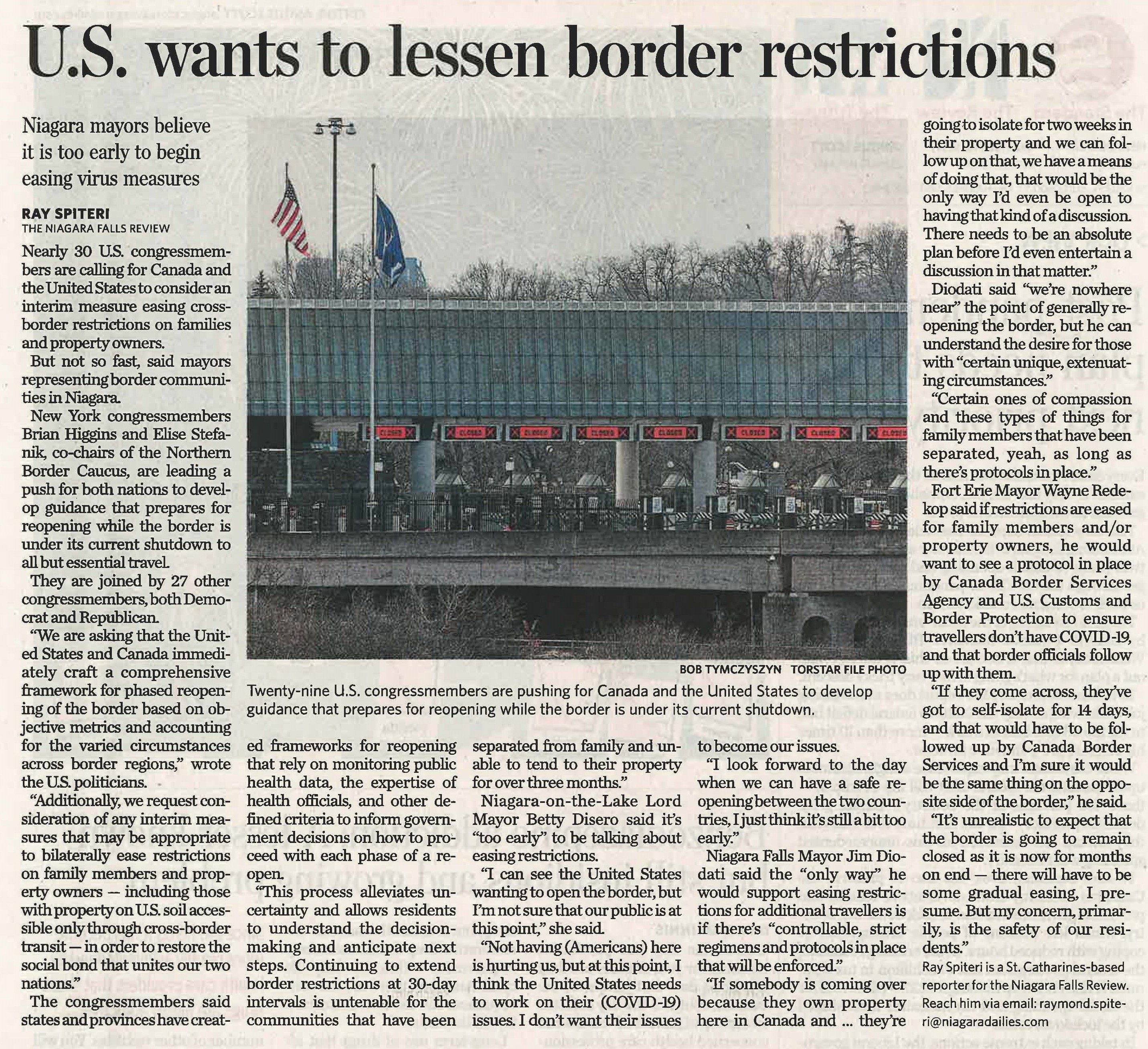 U.S. wants to lessen border restrictions : Niagara mayors believe it is too early to begin easing virus measures