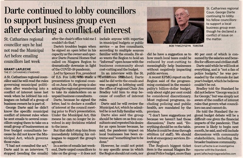- Darte continued to lobby councillors to support business group even after declaring a conflict of interest : St. Catharines regional councillor says he had not read the Municipal Act before emailing councillors last week