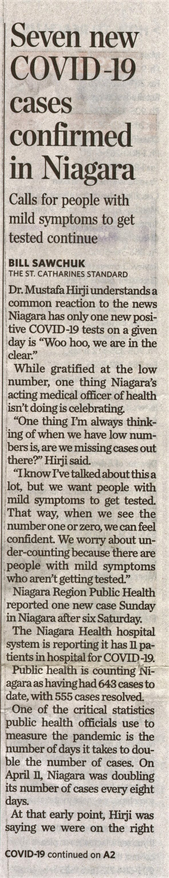 - Seven new COVID-19 cases confirmed in Niagara : Calls for people with mild symptoms to get tested continue