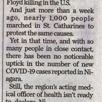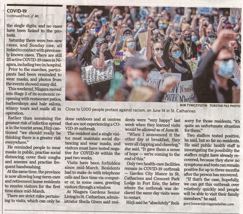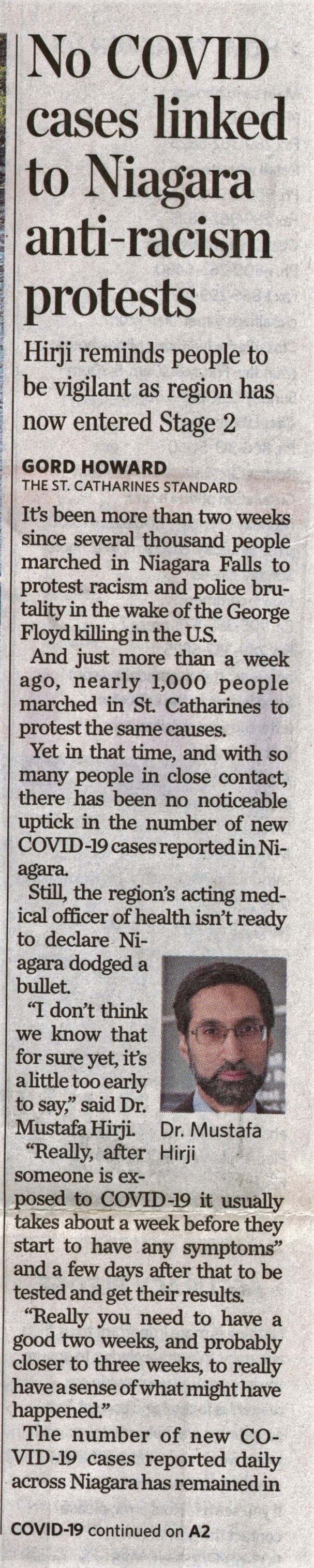 - No COVID cases linked to Niagara anti-racism protests : Hirji reminds people to be vigilant as region has now entered Stage 2