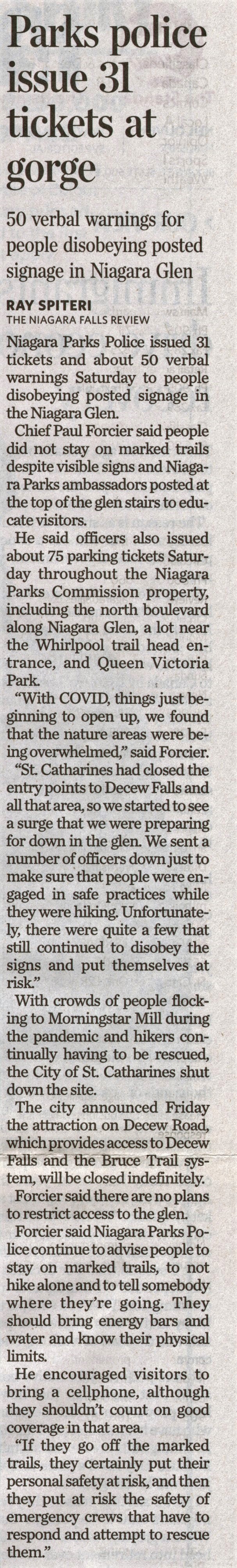 - Parks police issue 31 tickets at gorge : 50 verbal warnings for people disobeying posted signage in Niagara Glen