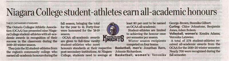 - Ontario Colleges Athletic Association / Ravn, Jonathan / Richarson, Johnnie / George-Brown, Veronika / Gilbert, Steenika / Johnstone, Chloe / Jones, Benjamin / Rolson, Adam / Adams, Kendra / Latawiec, Veronika / academic awards / sports