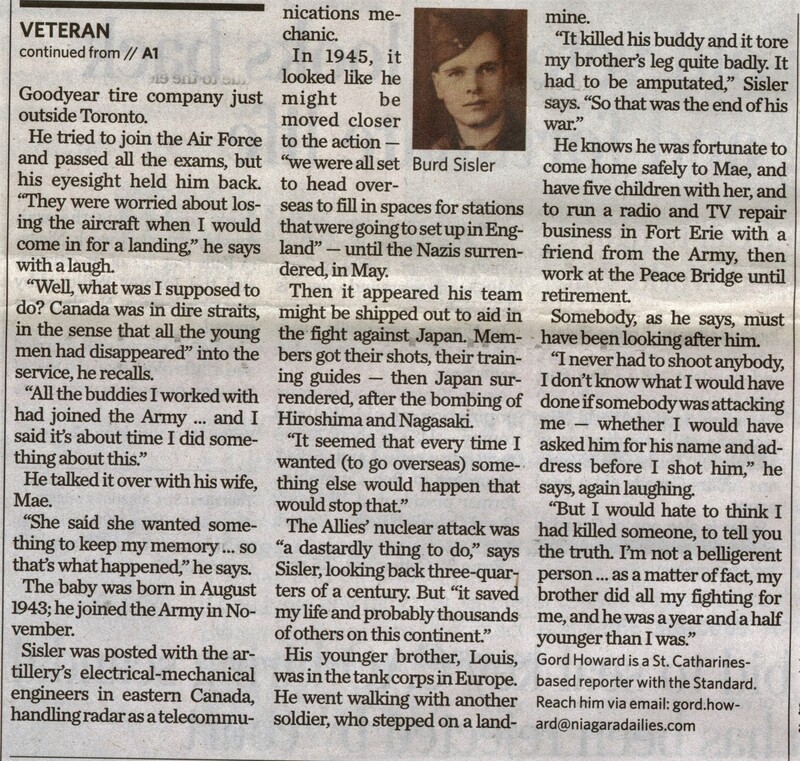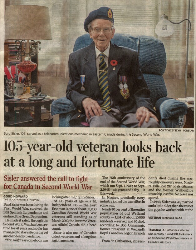- 105-year-old veteran looks back at a long and fortunate life : Sisler answered the call to fight for Canada in Second World War