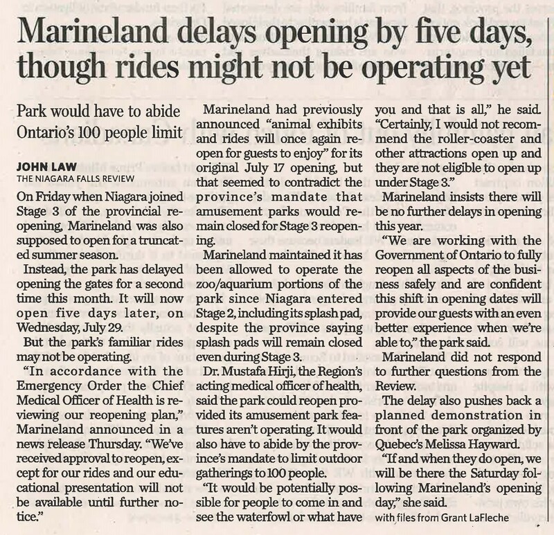 Marineland delays opening by five days, though rides might not be operating yet : park would have to abide Ontario's 100 people limit