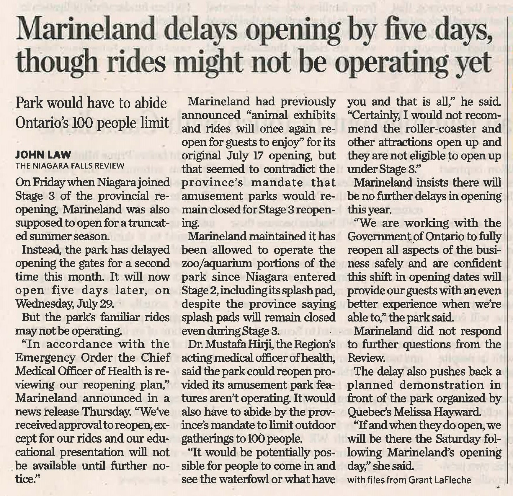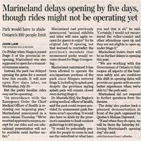 - Marineland delays opening by five days, though rides might not be operating yet : park would have to abide Ontario's 100 people limit