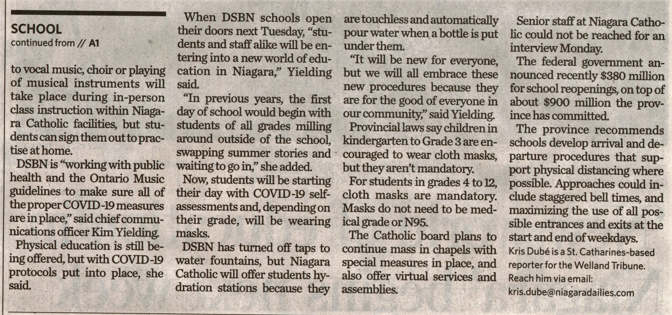 - District School Board of Niagara / Niagara Catholic District School Board / COVID-19 protocols / Yielding, Kim