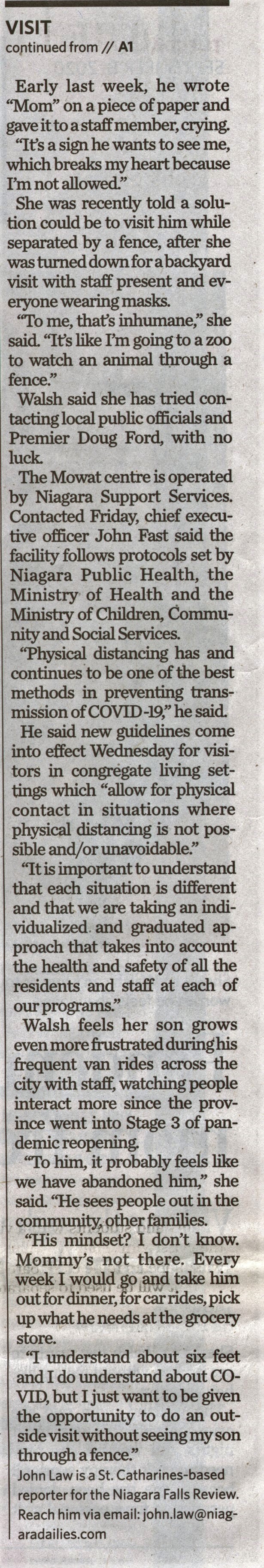 - Pandemic rules keep Niagara mom from seeing autistic child : Visiting through window will do more harm than good, Walsh says