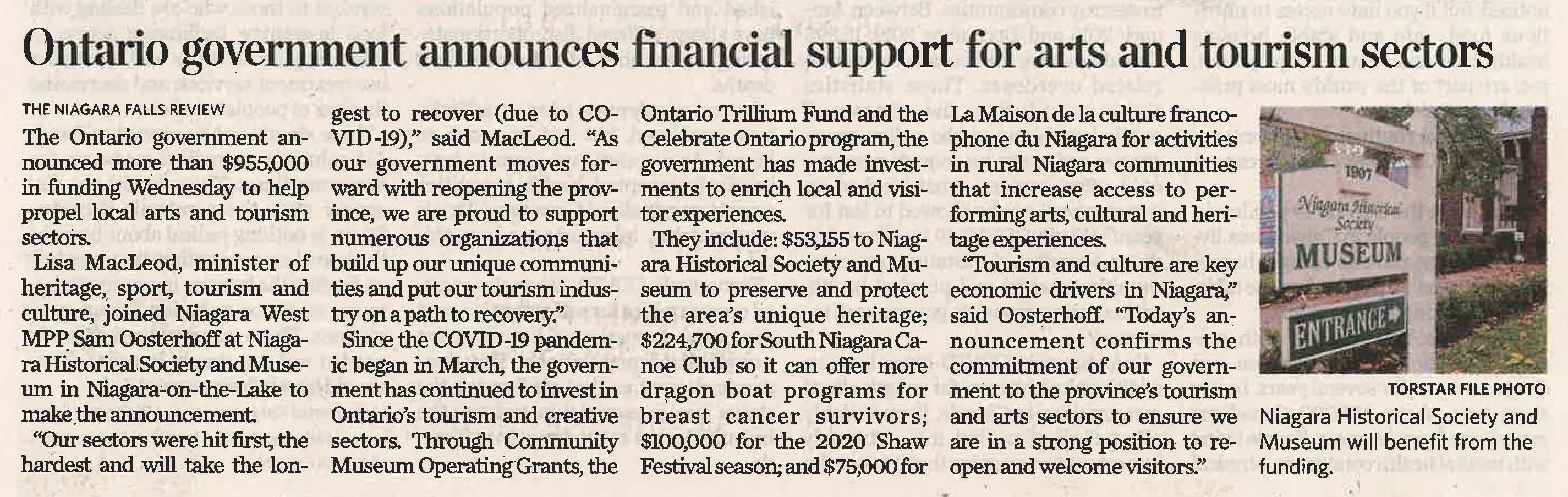 - Ontario government announces financial support for arts and tourism sectors