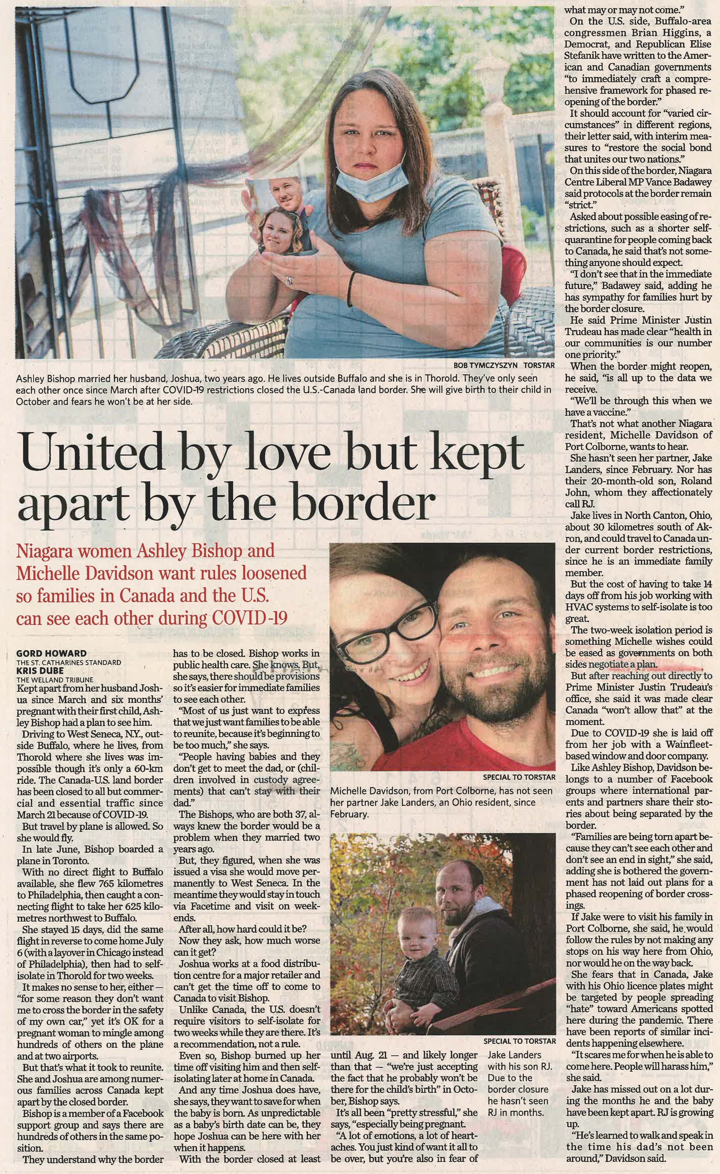 - United by love but kept apart by the border : Niagara women Ashley Bishop and Michelle Davidson want rules loosened so families in Canada and the U.S. can see each other during COVID-19
