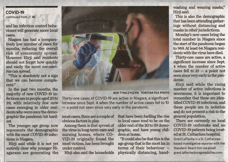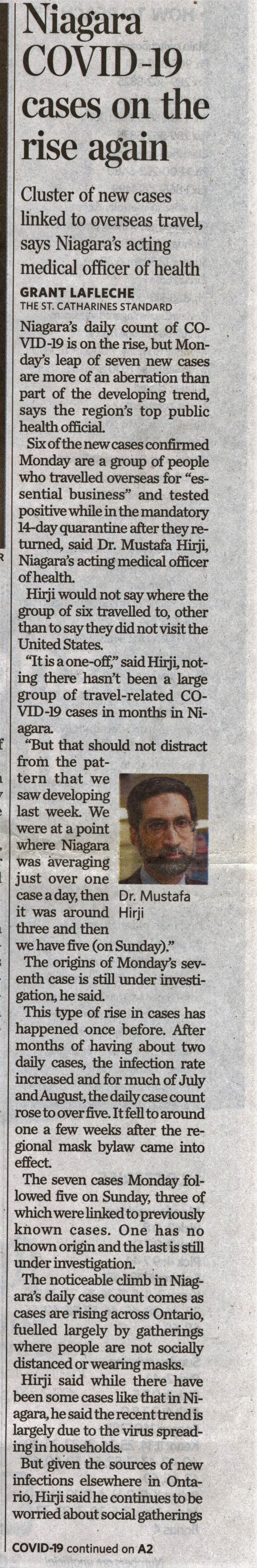 - Niagara COVID-19 cases on the rise again : Cluster of new cases linked to overseas travel, says Niagara's acting medical officer of health