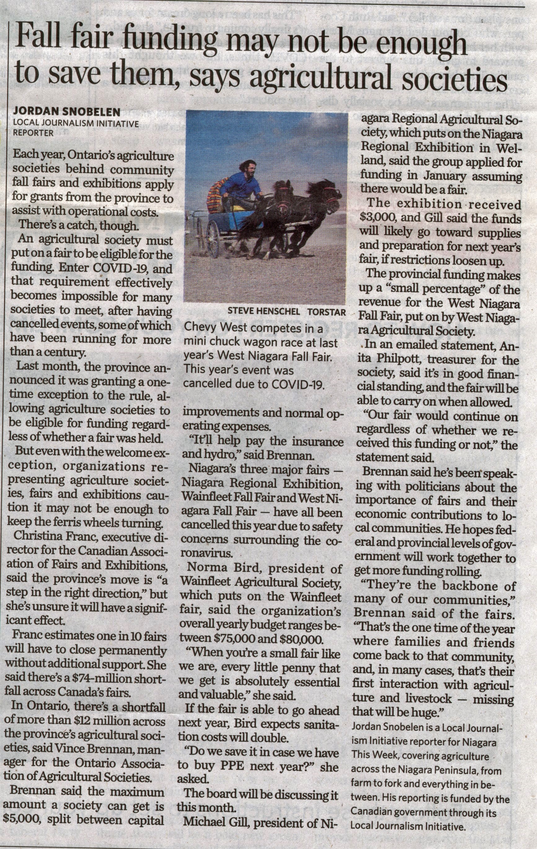 - Canadian Association of Fairs and Exhibitions / COVID-19 pandemic / West, Chevy / West Niagara Fall Fair / operational costs