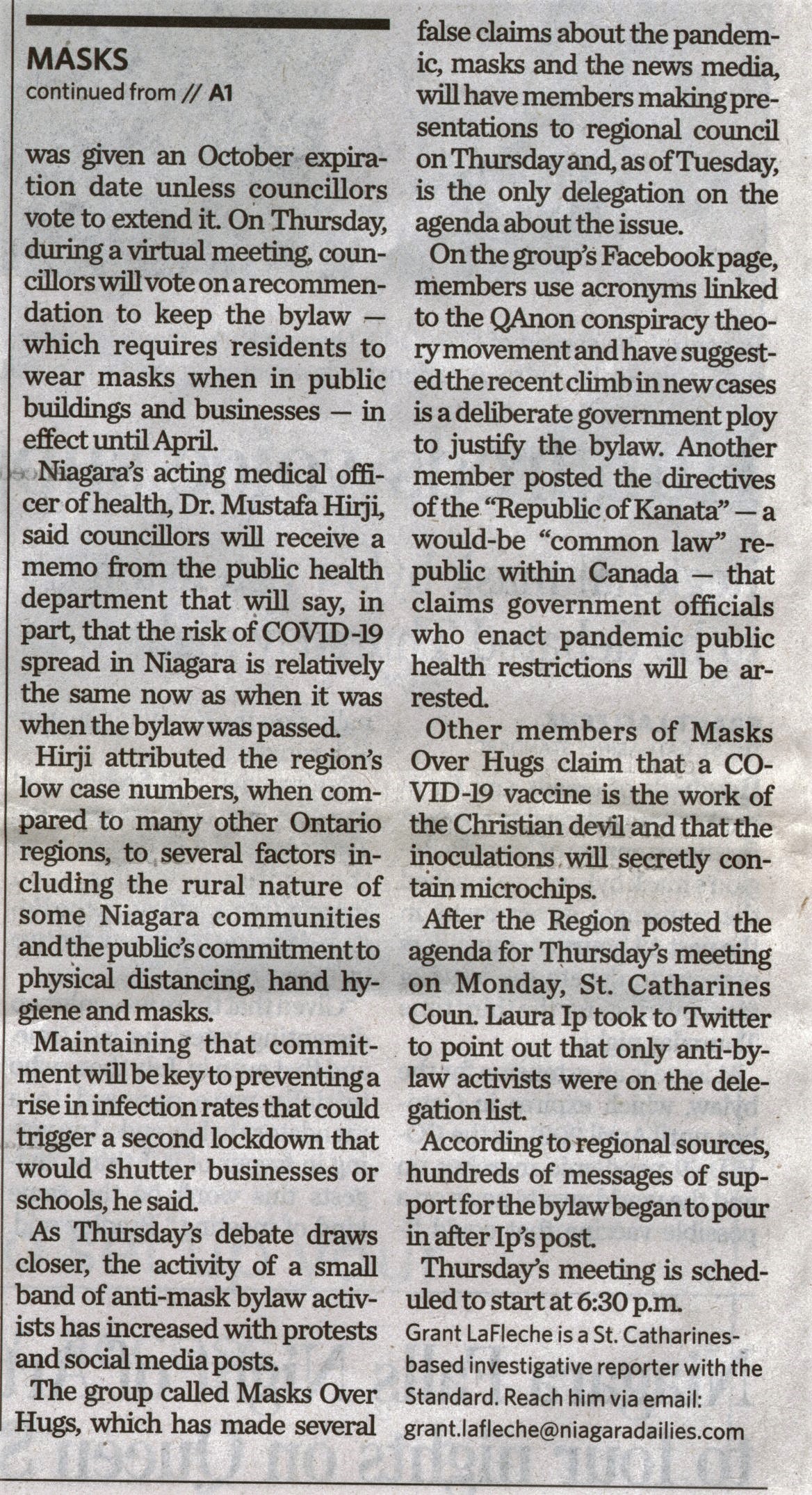 - COVID-19 pandemic / mask bylaw / Niagara Region / councillors to debate