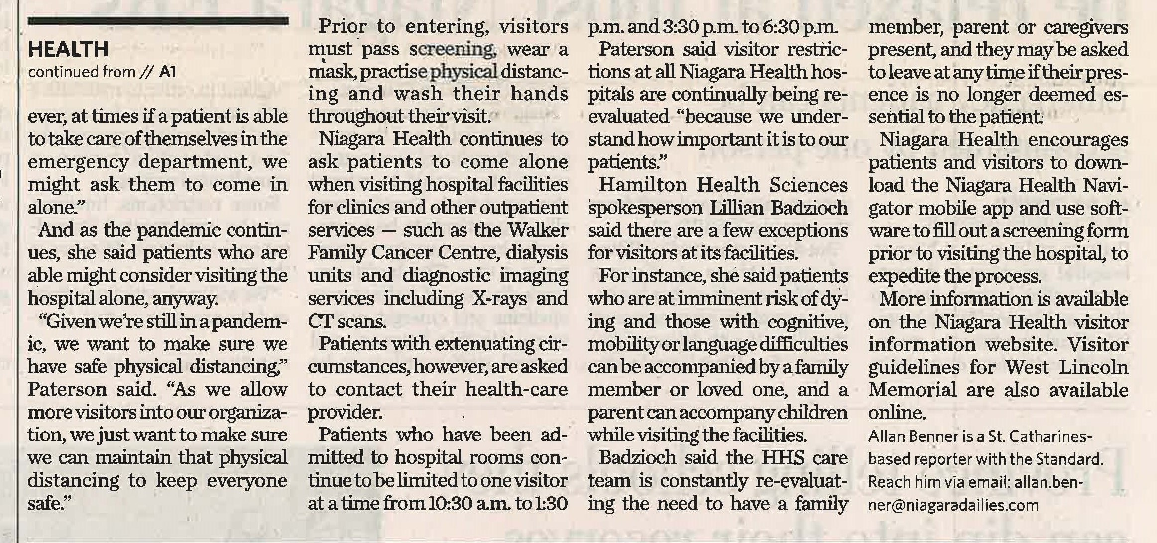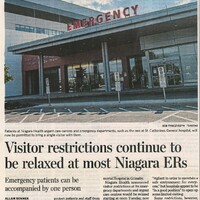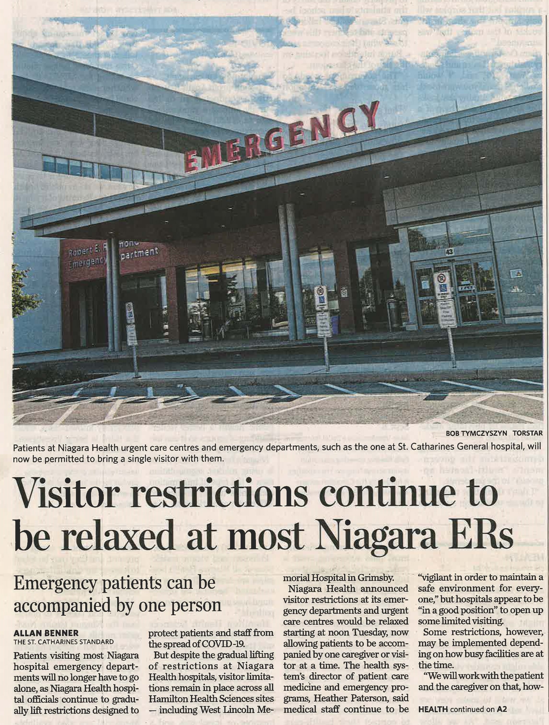 - Visitor restrictions continue to be relaxed at most Niagara ERs : Emergency patients can be accompanied by one person