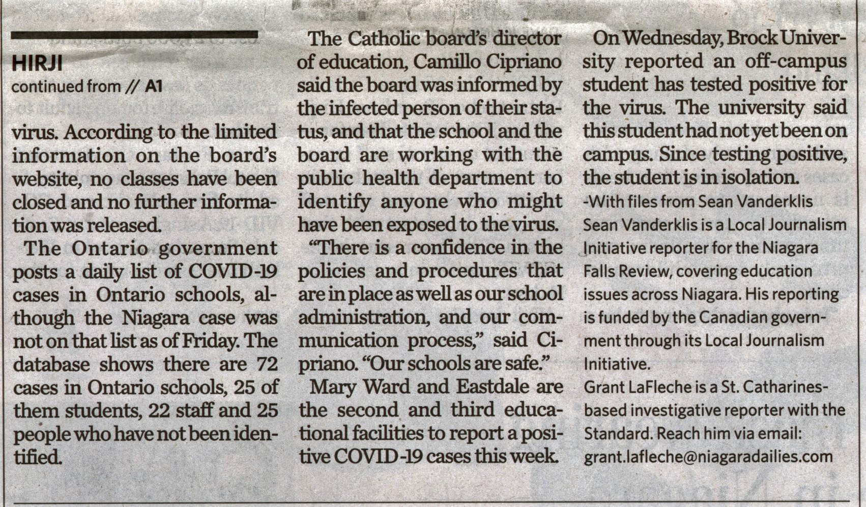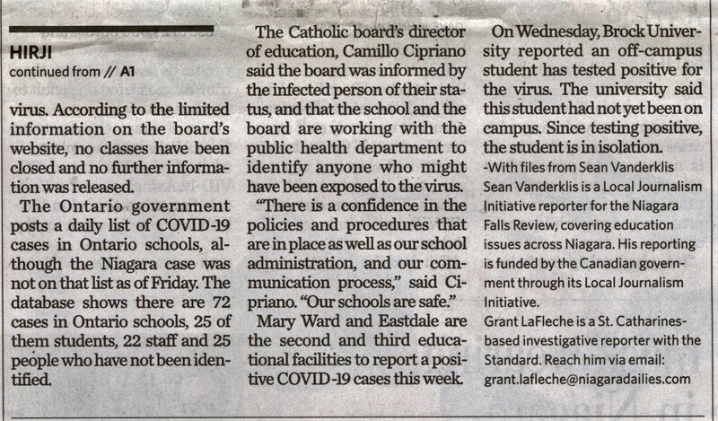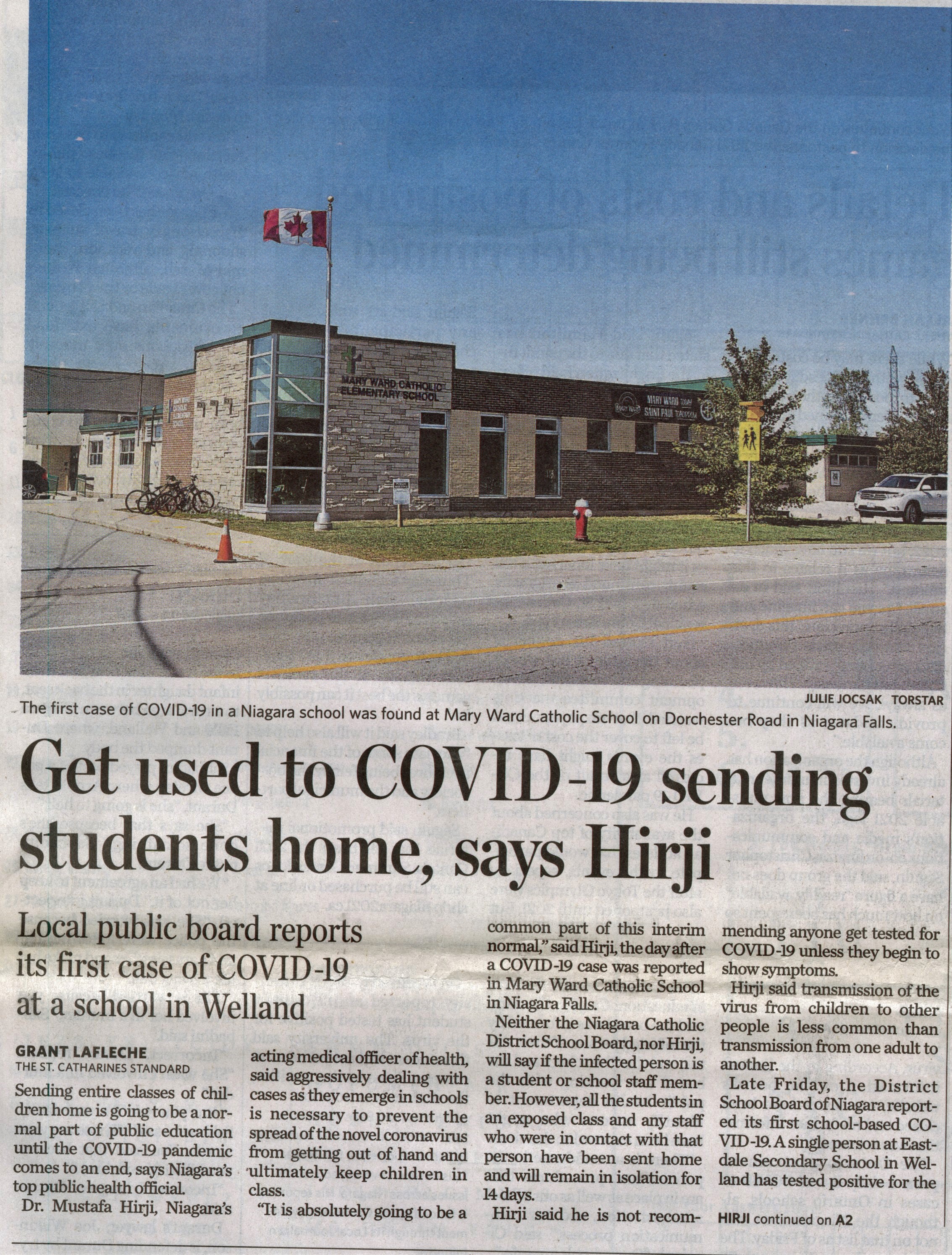 - Get used to COVID-19 sending students home, says Hirji : Local public board reports its first case of COVID-19 at a school in Welland