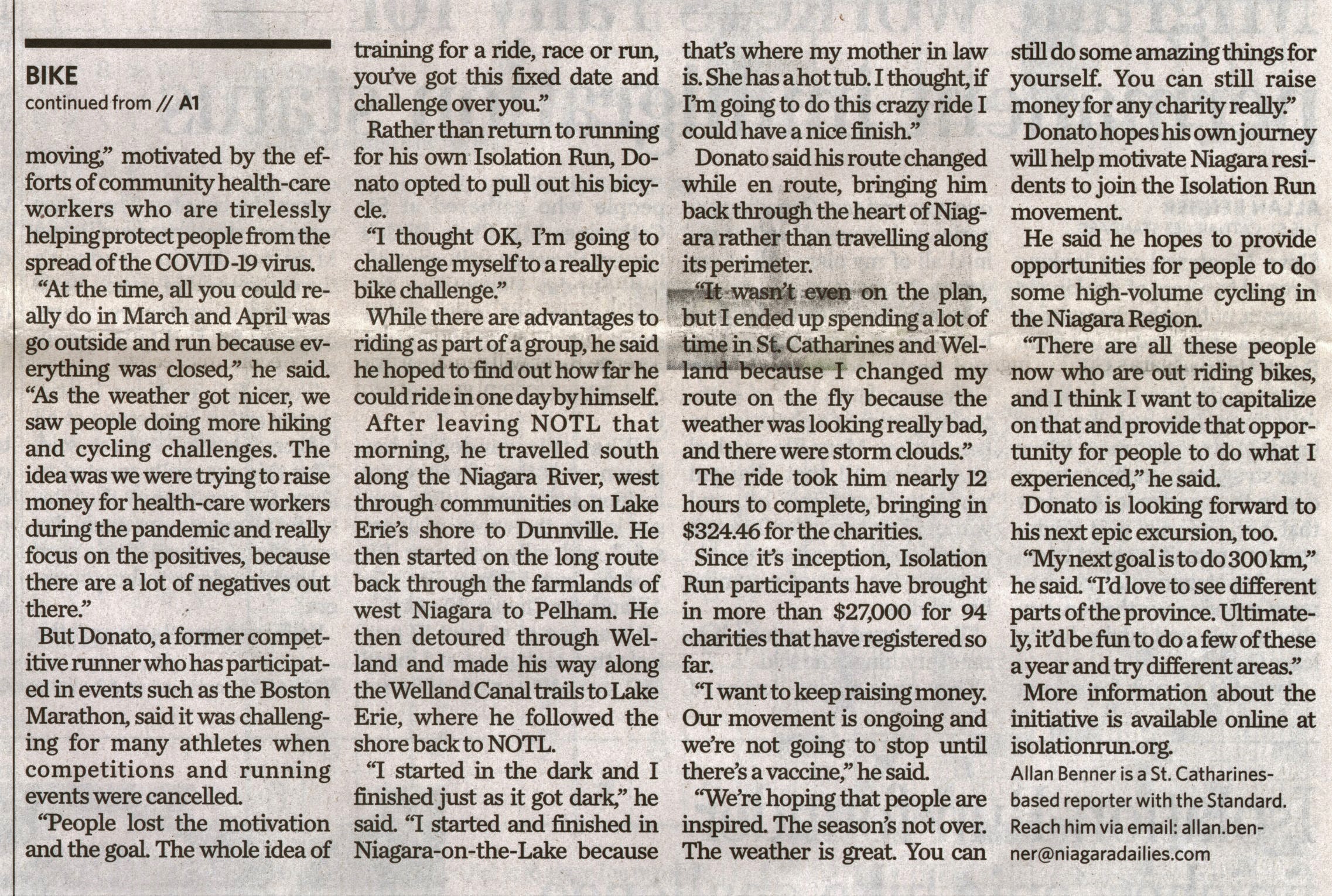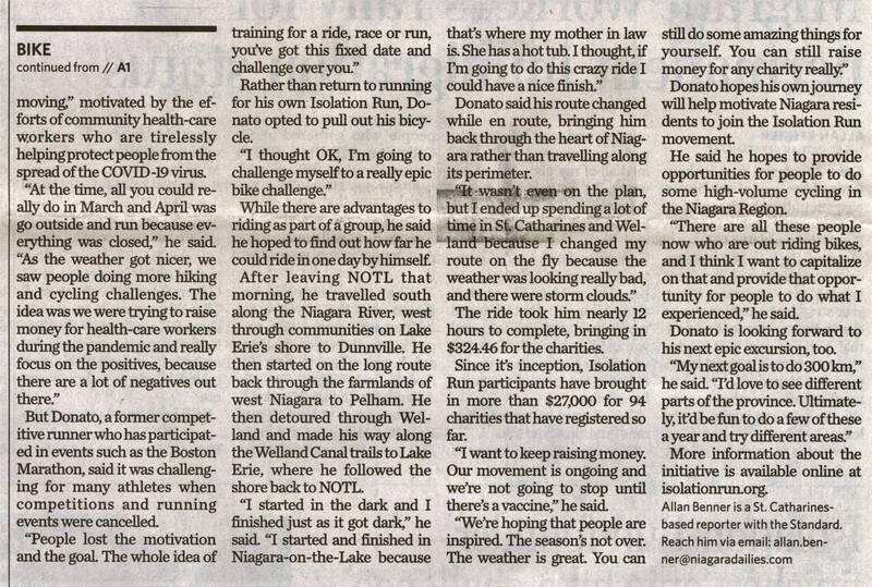 - Isolation Run founder finishes 'epic bike challenge' : Donato rode 273 kilometres through region as part of fundraising initiative