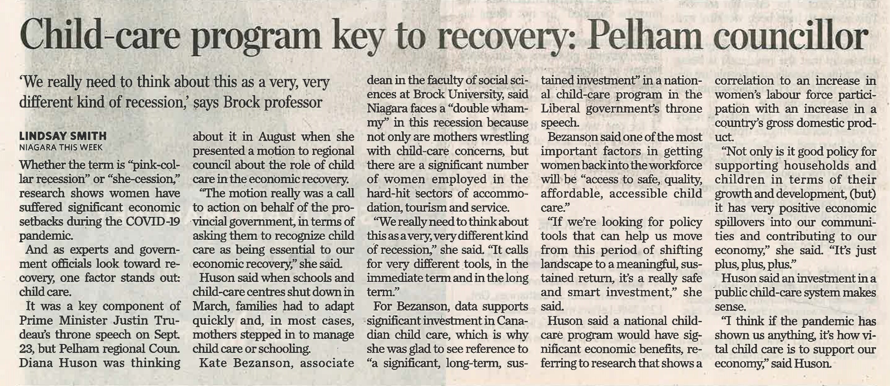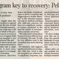 - Child-care program key to recovery : Pelham councillor : we really need to think about this as a very, very different kind of recession, says Brock professor