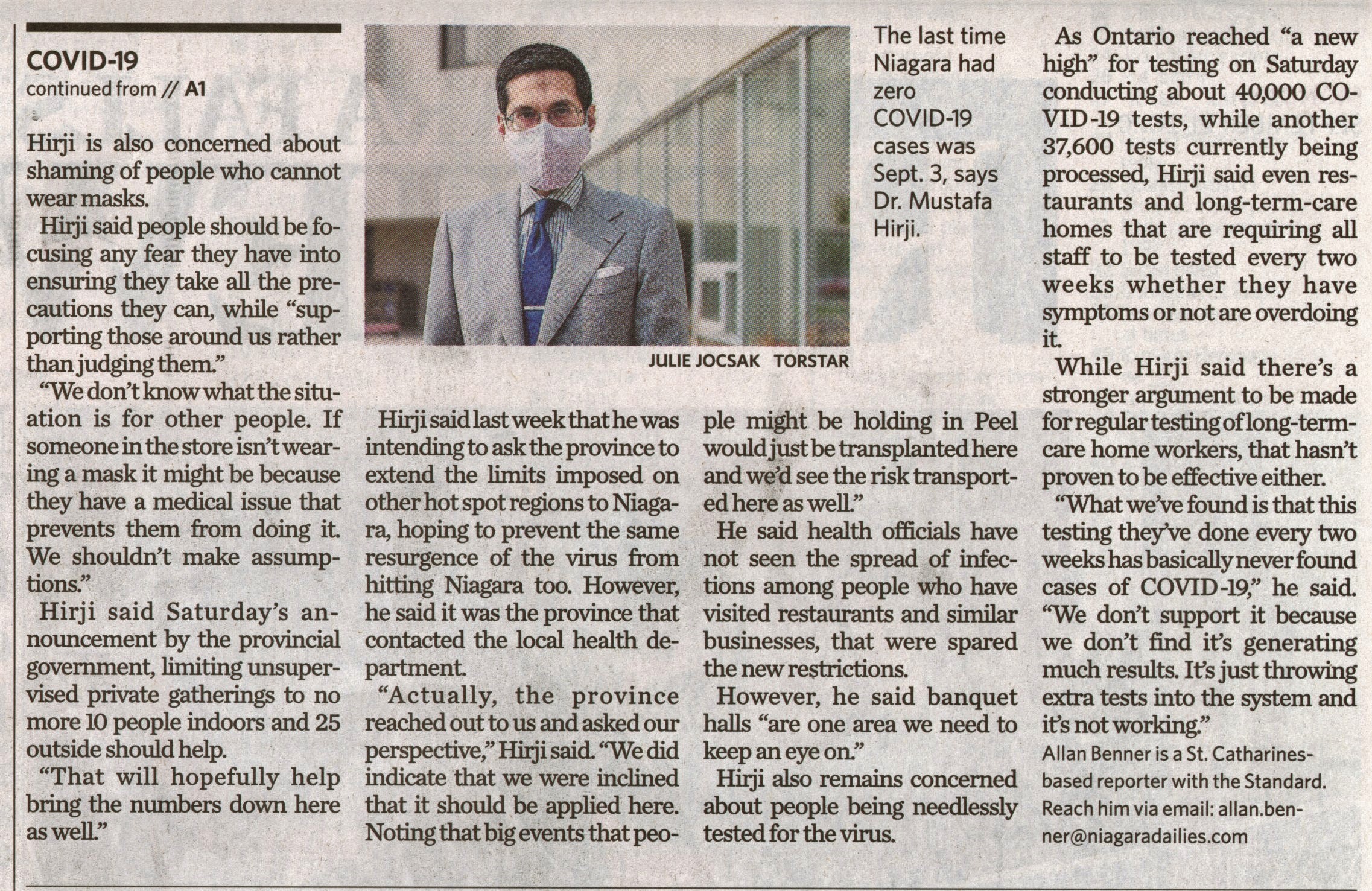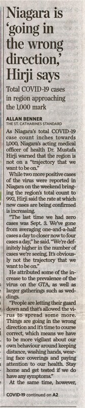 Niagara is 'going in the wrong direction' Hirji says : Total COVID-19 cases in region approaching the 1,000 mark