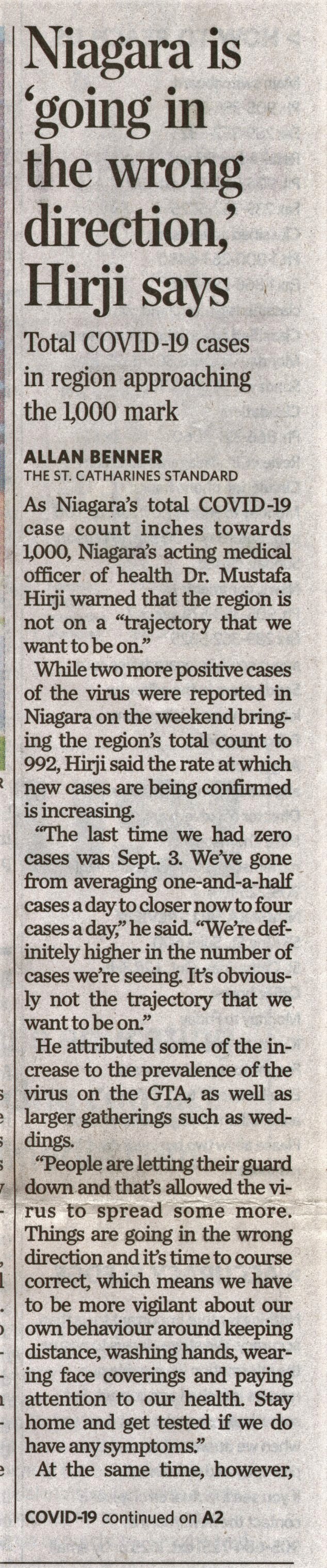 - Niagara is 'going in the wrong direction' Hirji says : Total COVID-19 cases in region approaching the 1,000 mark