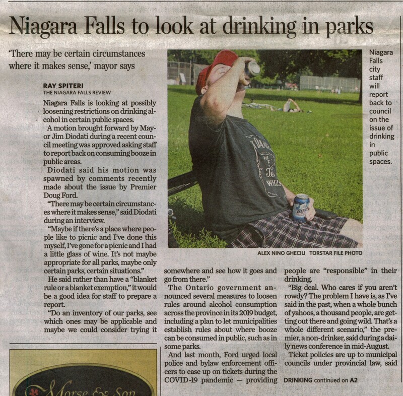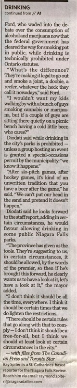 - Niagara Falls to look at drinking in parks : 'There may be certain circumstances where it makes sense,' mayor says