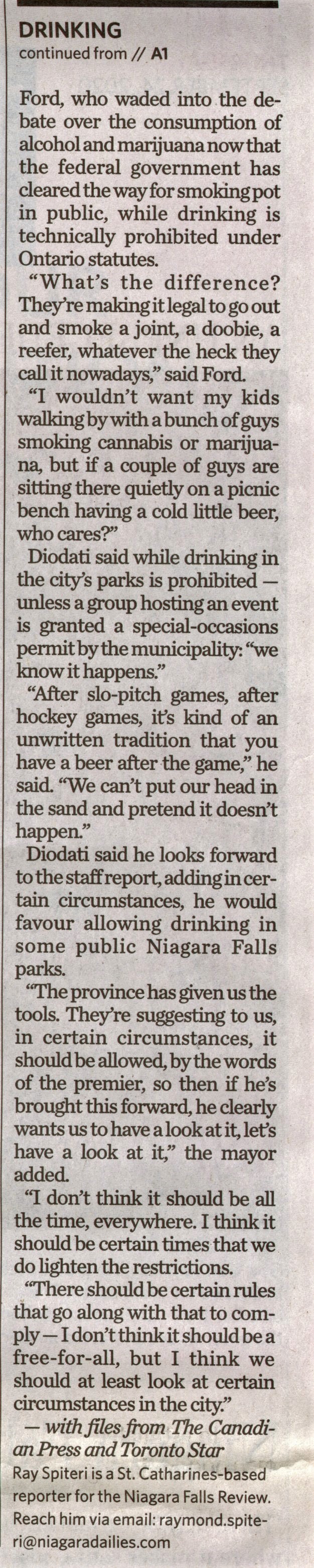 Niagara Falls to look at drinking in parks : 'There may be certain circumstances where it makes sense,' mayor says