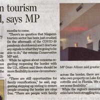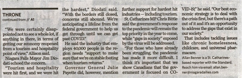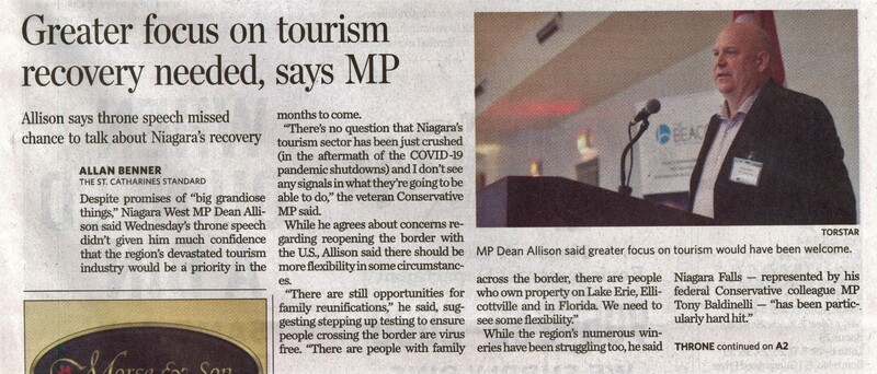 - Greater focus on tourism recovery needed says MP : Allison says throne speech missed chance to talk about Niagara's recovery