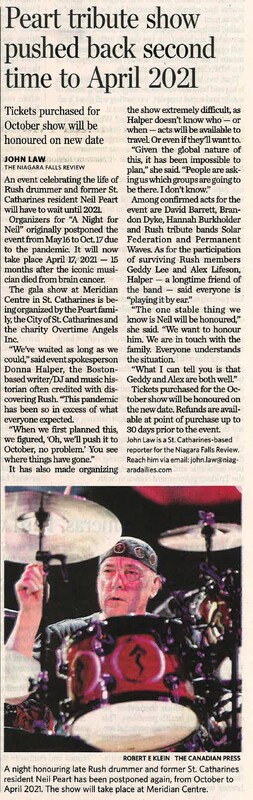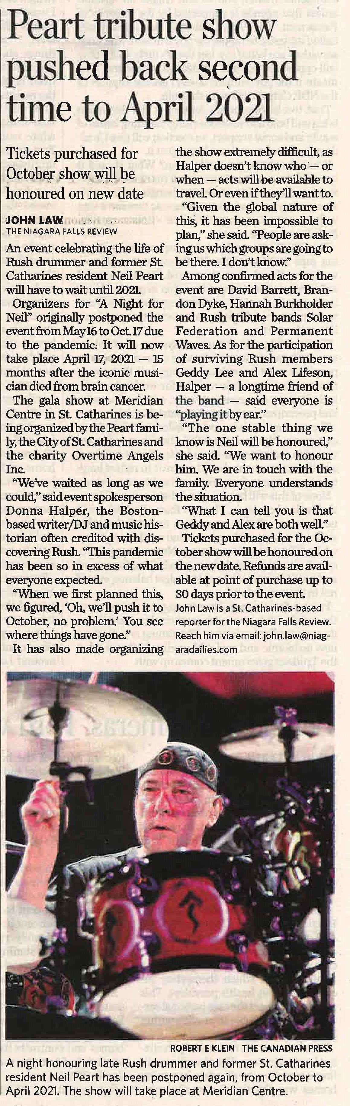 - Peart tribute show pushed back second time to April 2021 : tickets purchased for October show will be honoured on new date