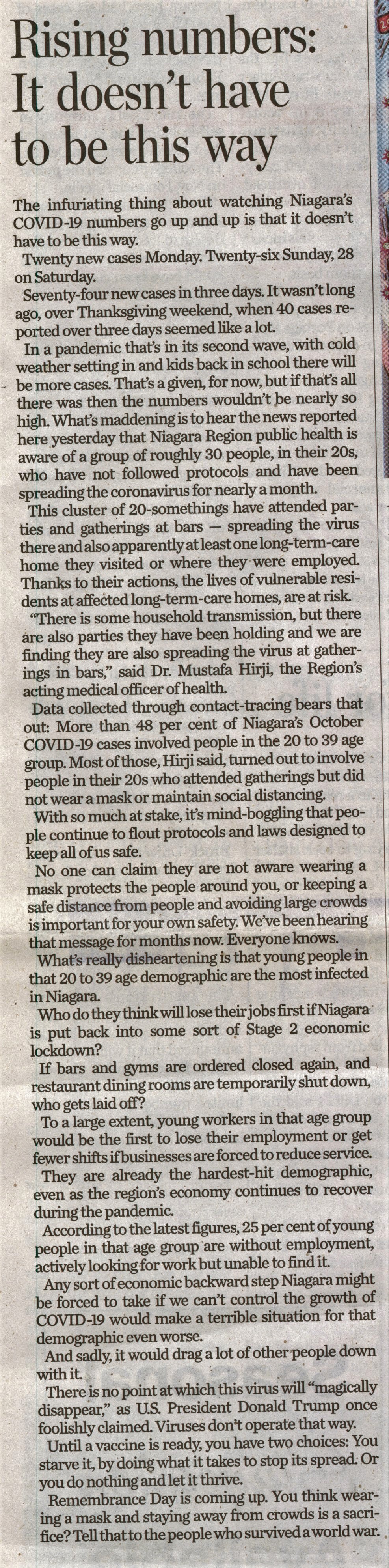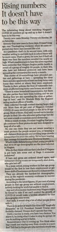 - COVID-19 pandemic / cases rising / Niagara Region / public health / Hirji, Mustafa Dr. / follow protocols